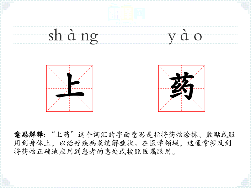 - 反义词:停药、撤药。这些词汇表示停止使用药物,与“上药”形成对比。