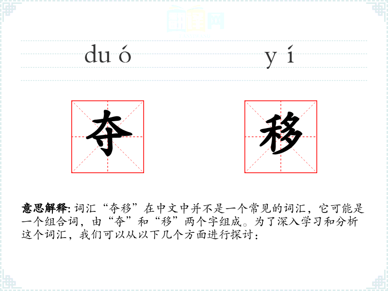 词汇“夺移”在中文中并不是一个常见的词汇,它可能是一个组合词,由“夺”和“移”两个字组成。为了深入学*和分析这个词汇,我们可以从以下几个方面进行探讨: