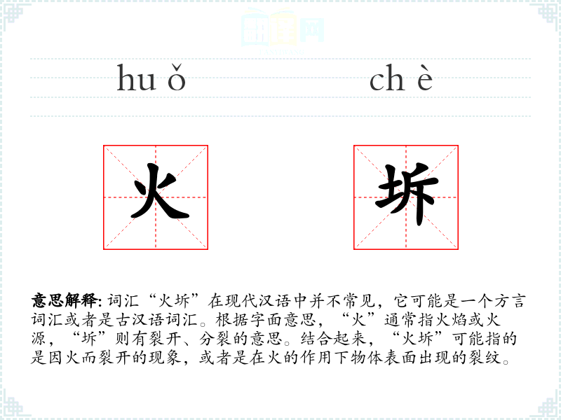- 词源:火坼可能是由“火”和“坼”两个字组合而成,其中“坼”在古汉语中有裂开的意思。