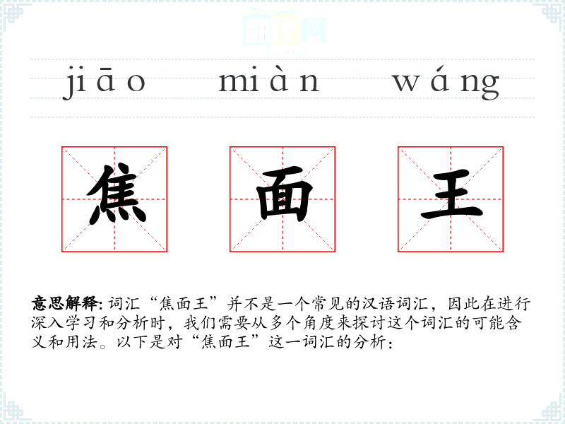 词汇“焦面王”并不是一个常见的汉语词汇,因此在进行深入学习和分析时,我们需要从多个角度来探讨这个词汇的可能含义和用法。以下是对“焦面王”这一词汇的分析: