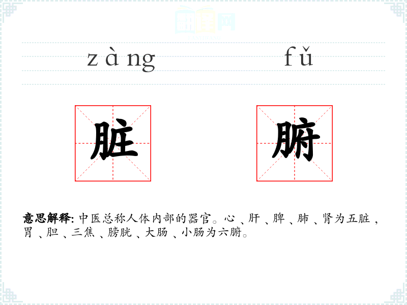 中医总称人体内部的器官。心﹑肝﹑脾﹑肺﹑肾为五脏﹐胃﹑胆﹑三焦﹑膀胱﹑大肠﹑小肠为六腑。