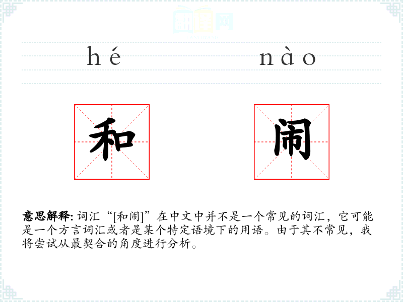 由于“和闹”不是一个标准的中文词汇,我们无法给出确切的基本定义。它可能是某个地区方言中的词汇,或者是特定社群中的俚语。