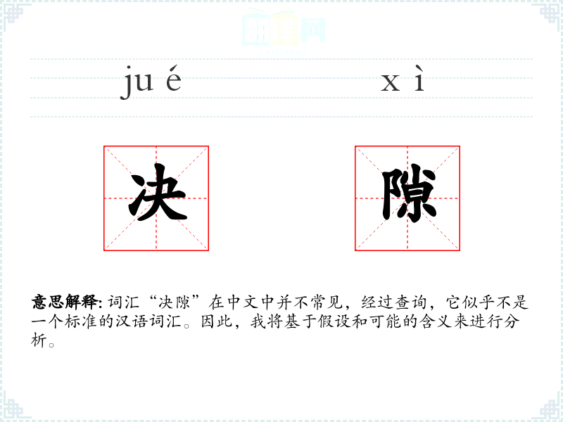 假设“决隙”是由“决”和“隙”两个字组合而成的词汇。其中,“决”可以表示决定、解决,而“隙”通常指裂缝、空隙或机会。结合起来,“决隙”可能指的是在关键时刻做出决定或利用机会。