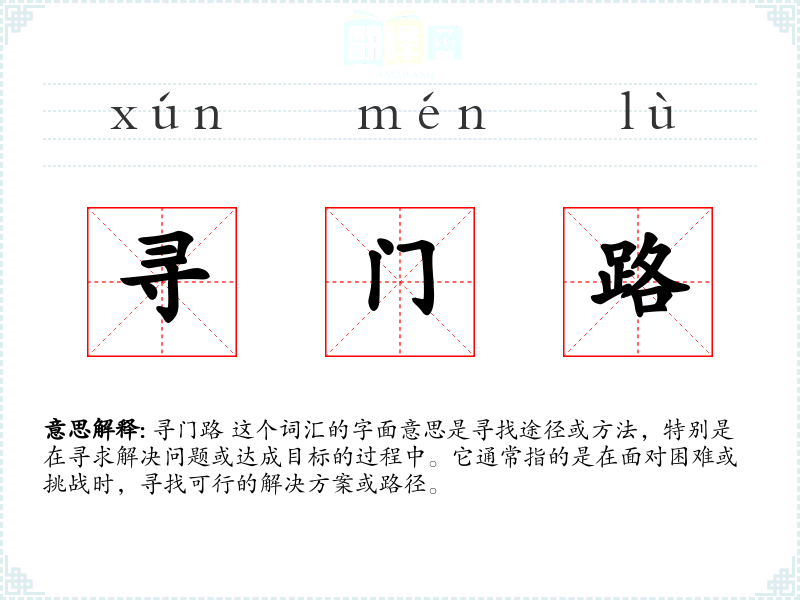 寻门路 这个词汇的字面意思是寻找途径或方法,特别是在寻求解决问题或达成目标的过程中。它通常指的是在面对困难或挑战时,寻找可行的解决方案或路径。