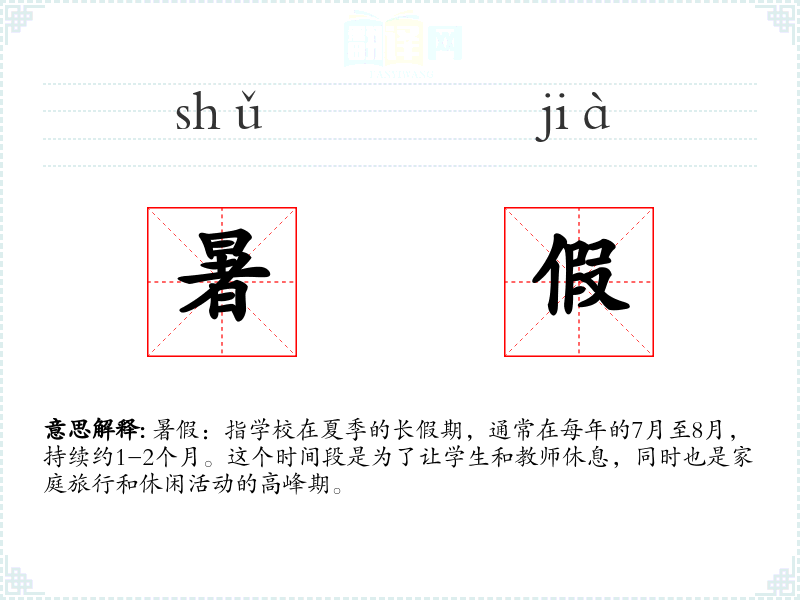 - 反义词:寒假(冬季的学校假期)