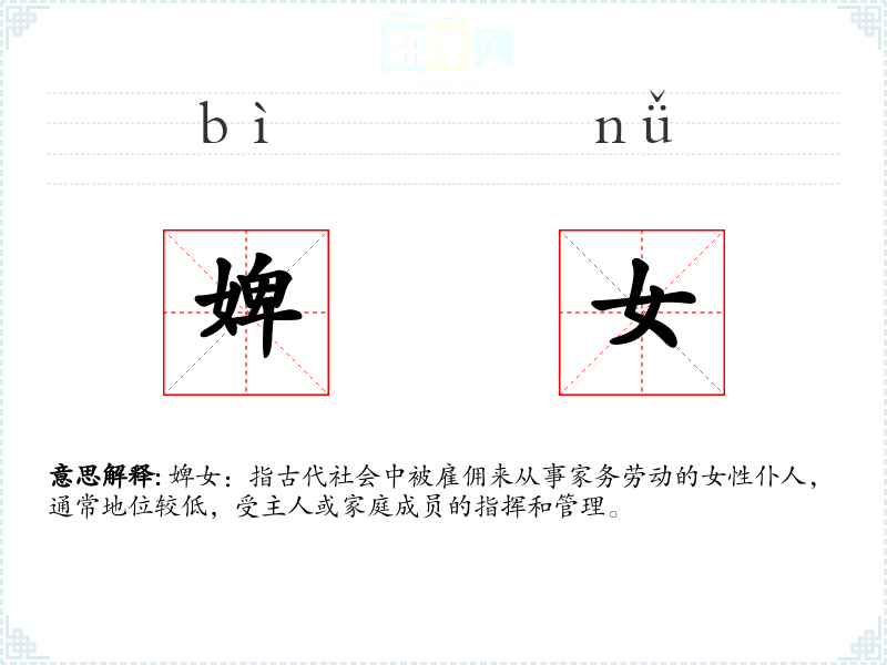 婢女:指古代社会中被雇佣来从事家务劳动的女性仆人,通常地位较低,受主人或家庭成员的指挥和管理。