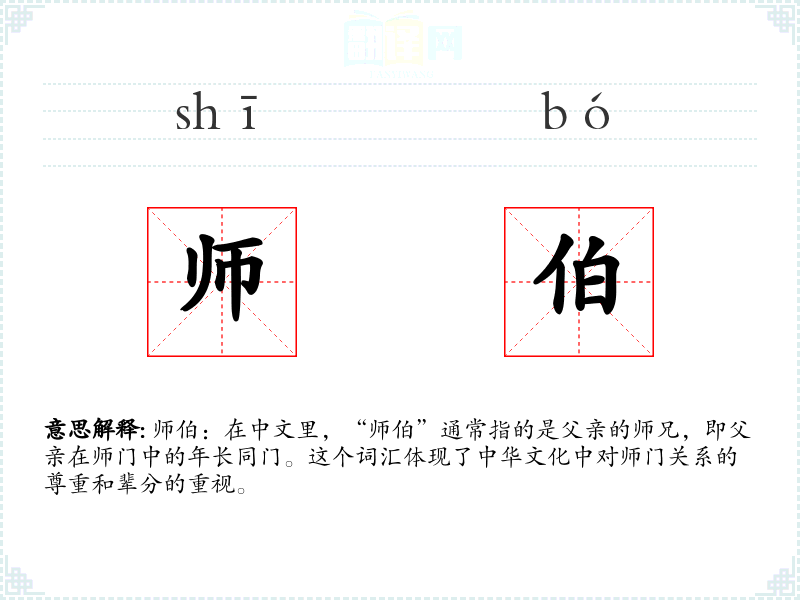 师伯:在中文里,“师伯”通常指的是父亲的师兄,即父亲在师门中的年长同门。这个词汇体现了中华文化中对师门关系的尊重和辈分的重视。