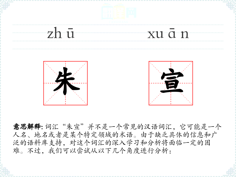 综上所述,由于“朱宣”不是一个标准词汇,我们无法对其进行深入的学习和分析。如果它出现在某个特定的语境中,我们可以根据具体的语境来探讨其含义和用法。