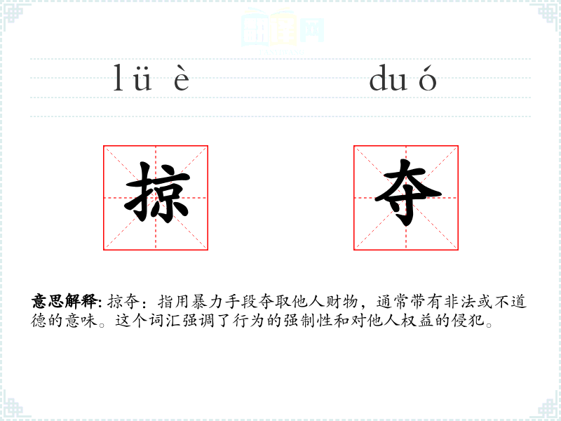 掠夺:指用暴力手段夺取他人财物,通常带有非法或不道德的意味。这个词汇强调了行为的强制性和对他人权益的侵犯。