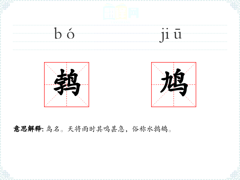 鸟名。天将雨时其鸣甚急,俗称水鹁鸪。