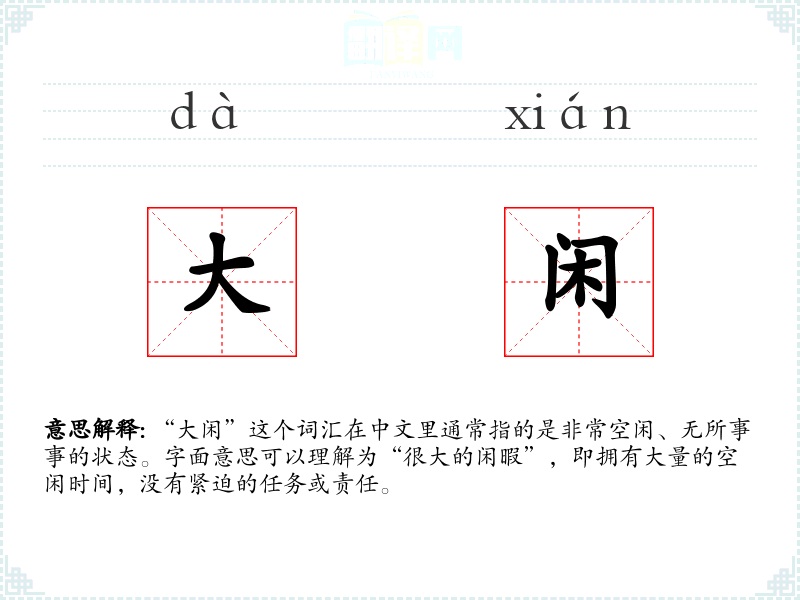 “大闲”这个词汇的词源较为直接,由“大”和“闲”两个字组成,没有特别复杂的历史演变。在古代汉语中,“闲”字已有空闲、闲暇的含义,而“大”字则加强了这种状态的程度。