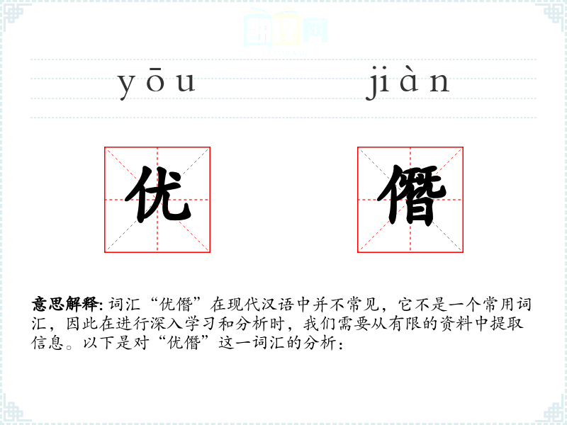 词汇“优僭”在现代汉语中并不常见,它不是一个常用词汇,因此在进行深入学*和分析时,我们需要从有限的资料中提取信息。以下是对“优僭”这一词汇的分析: