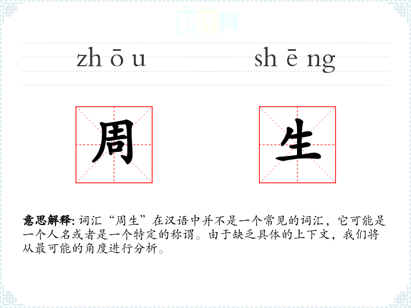 词汇“周生”在汉语中并不是一个常见的词汇,它可能是一个人名或者是一个特定的称谓。由于缺乏具体的上下文,我们将从最可能的角度进行分析。