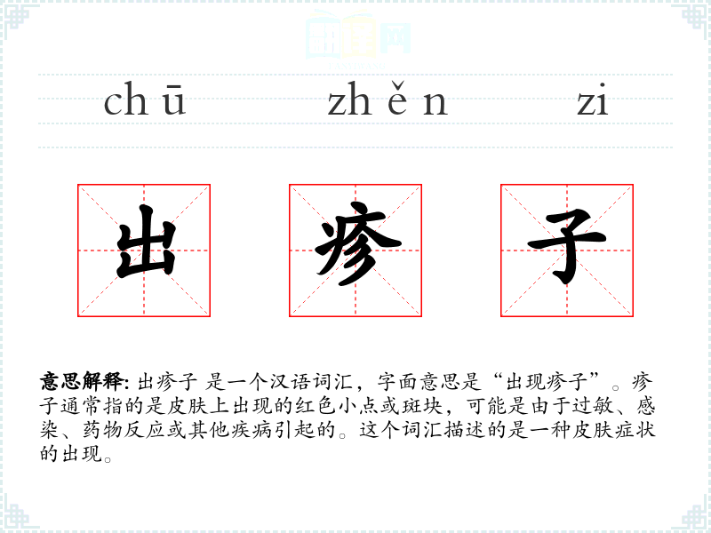 出疹子 是一个汉语词汇,字面意思是“出现疹子”。疹子通常指的是皮肤上出现的红色小点或斑块,可能是由于过敏、感染、药物反应或其他疾病引起的。这个词汇描述的是一种皮肤症状的出现。