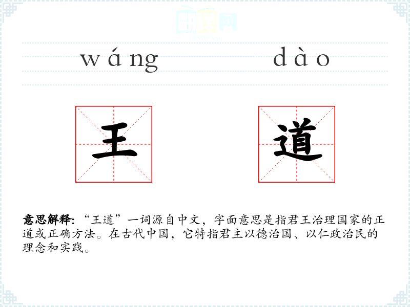 “王道”一词源自中文,字面意思是指君王治理国家的正道或正确方法。在古代中国,它特指君主以德治国、以仁政治民的理念和实践。