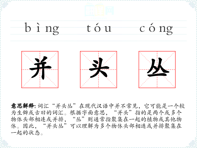 词汇“并头丛”在现代汉语中并不常见,它可能是一个较为生僻或古旧的词汇。根据字面意思,“并头”指的是两个或多个物体头部相连或并排,“丛”则通常指聚集在一起的植物或其他物体。因此,“并头丛”可以理解为多个物体头部相连或并排聚集在一起的状态。
