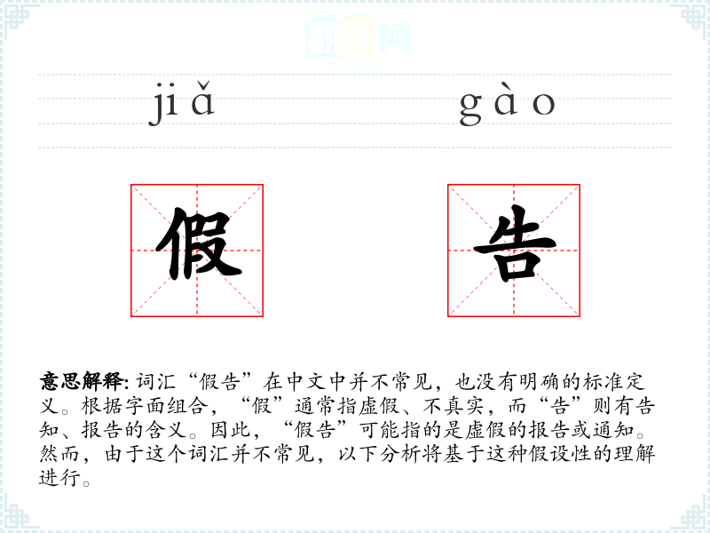 词汇“假告”在中文中并不常见,也没有明确的标准定义。根据字面组合,“假”通常指虚假、不真实,而“告”则有告知、报告的含义。因此,“假告”可能指的是虚假的报告或通知。然而,由于这个词汇并不常见,以下分析将基于这种假设性的理解进行。