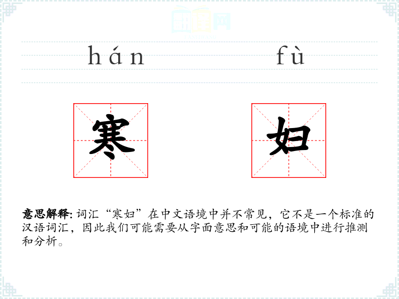 “寒妇”字面意思可能是指“贫穷或生活条件艰苦的妇女”。其中,“寒”通常与寒冷、贫穷或简陋相关,而“妇”则指妇女。