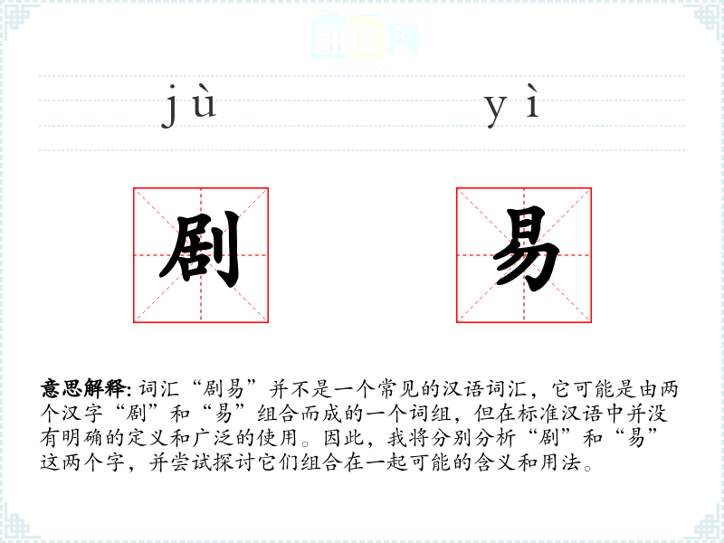 “剧易”作为一个词组,虽然在标准汉语中没有明确的定义,但通过对“剧”和“易”两个字的分析,我们可以推测它在特定语境中可能的含义和用法。在语言学*和表达中,理解词汇的多义性和组合的可能性是非常重要的。