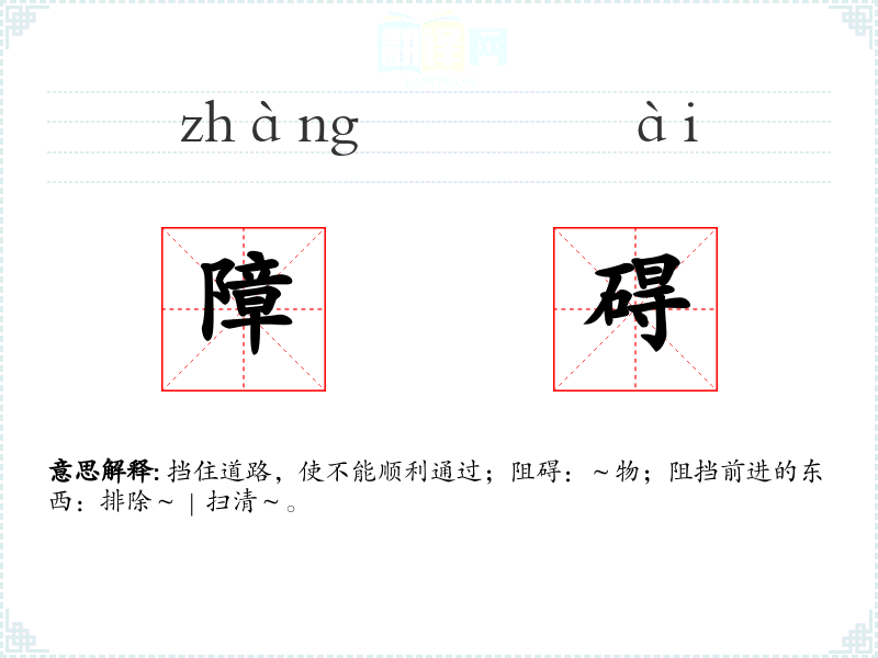 挡住道路,使不能顺利通过;阻碍:~物;阻挡前进的东西:排除~|扫清~。