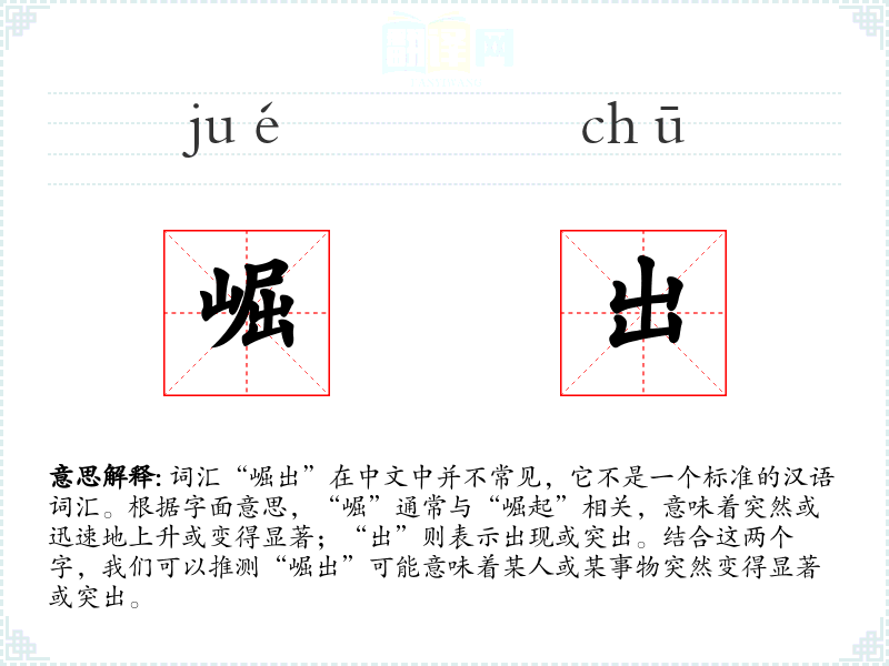 词汇“崛出”在中文中并不常见,它不是一个标准的汉语词汇。根据字面意思,“崛”通常与“崛起”相关,意味着突然或迅速地上升或变得显著;“出”则表示出现或突出。结合这两个字,我们可以推测“崛出”可能意味着某人或某事物突然变得显著或突出。