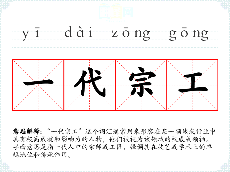 “一代宗工”这个词汇通常用来形容在某一领域或行业中具有极高成就和影响力的人物,他们被视为该领域的权威或领袖。字面意思是指一代人中的宗师或工匠,强调其在技艺或学术上的卓越地位和传承作用。