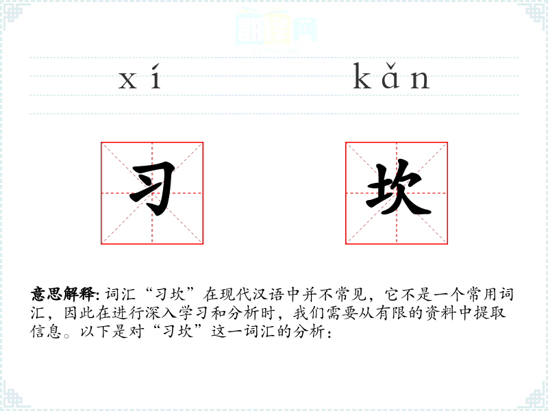 词汇“坎”在现代汉语中并不常见,它不是一个常用词汇,因此在进行深入学和分析时,我们需要从有限的资料中提取信息。以下是对“*坎”这一词汇的分析: