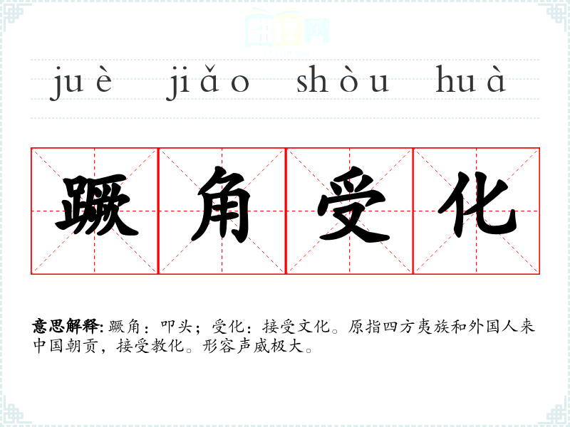 蹶角:叩头;受化:接受文化。原指四方夷族和外国人来中国朝贡,接受教化。形容声威极大。