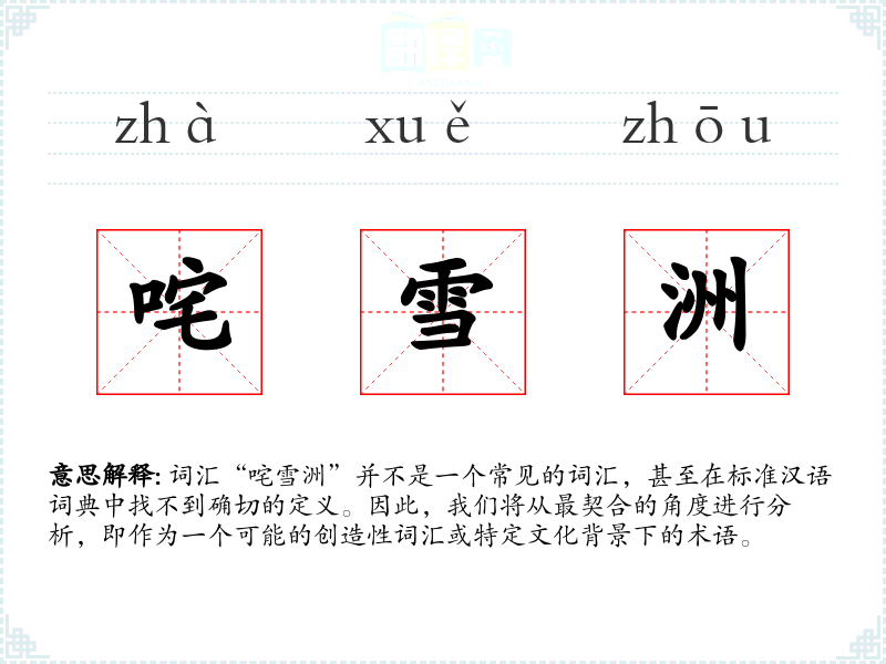 由于“咤雪洲”不是一个标准词汇,我们可以推测它可能是一个地名、人名或者是某个特定文化或故事中的术语。字面意思上,“咤”可能与“咤怒”有关,表示愤怒或惊讶;“雪”自然指的是雪;“洲”通常指水中陆地或大陆。结合起来,“咤雪洲”可能指的是一个被雪覆盖的、令人惊讶或愤怒的地方。