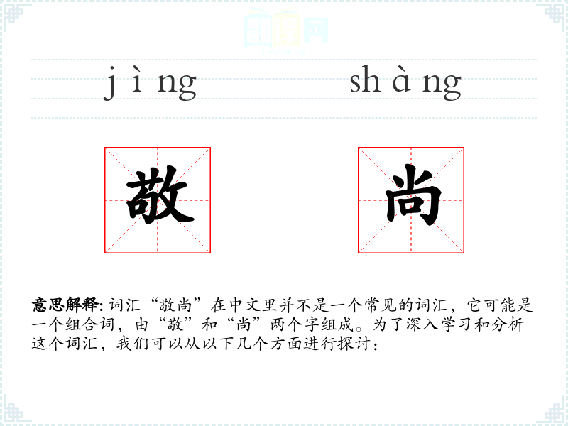 词汇“敬尚”在中文里并不是一个常见的词汇,它可能是一个组合词,由“敬”和“尚”两个字组成。为了深入学习和分析这个词汇,我们可以从以下几个方面进行探讨:
