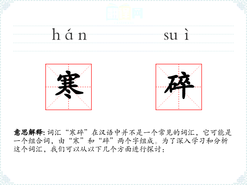 词汇“寒碎”在汉语中并不是一个常见的词汇,它可能是一个组合词,由“寒”和“碎”两个字组成。为了深入学习和分析这个词汇,我们可以从以下几个方面进行探讨: