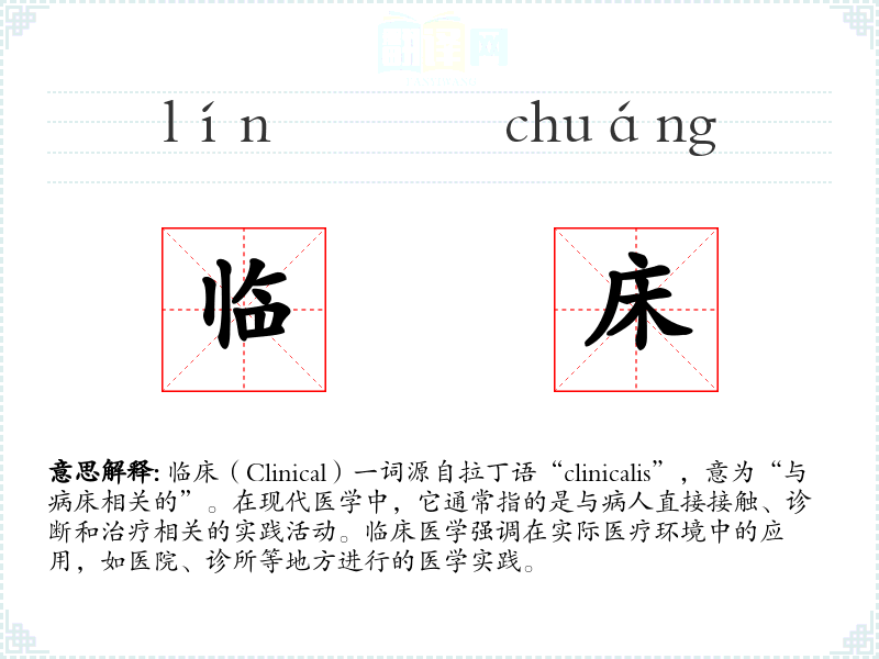 临床(Clinical)一词源自拉丁语“clinicalis”,意为“与病床相关的”。在现代医学中,它通常指的是与病人直接接触、诊断和治疗相关的实践活动。临床医学强调在实际医疗环境中的应用,如医院、诊所等地方进行的医学实践。