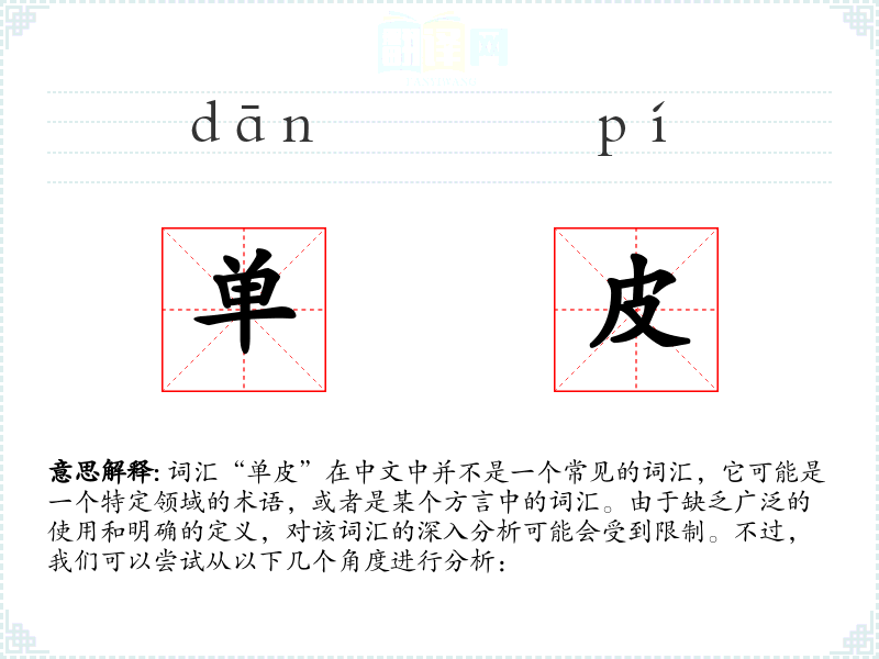词汇“单皮”在中文中并不是一个常见的词汇,它可能是一个特定领域的术语,或者是某个方言中的词汇。由于缺乏广泛的使用和明确的定义,对该词汇的深入分析可能会受到限制。不过,我们可以尝试从以下几个角度进行分析: