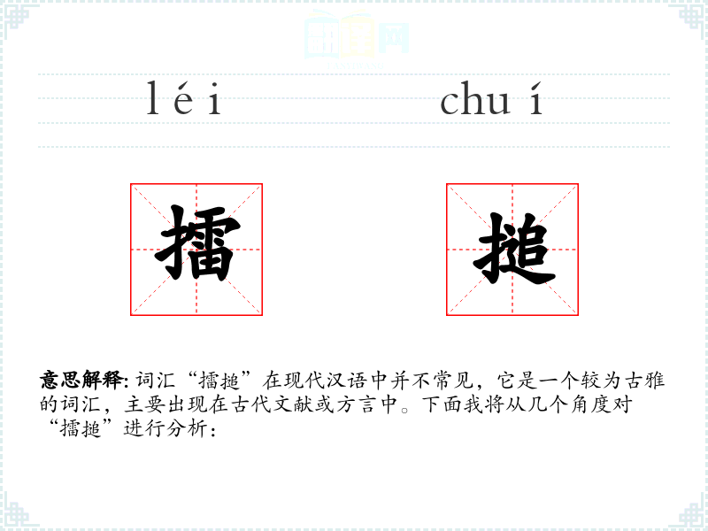 词汇“擂搥”在现代汉语中并不常见,它是一个较为古雅的词汇,主要出现在古代文献或方言中。下面我将从几个角度对“擂搥”进行分析: