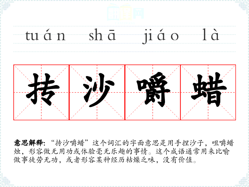 “抟沙嚼蜡”这个词汇的字面意思是用手捏沙子,咀嚼蜡烛,形容做无用功或体验毫无乐趣的事情。这个成语通常用来比喻做事徒劳无功,或者形容某种经历枯燥乏味,没有价值。
