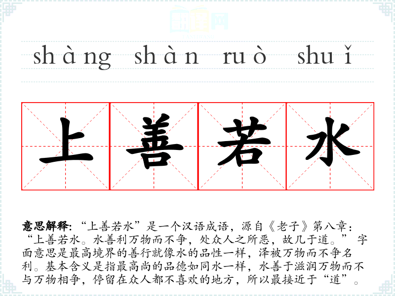 “上善若水”是一个汉语成语,源自《老子》第八章:“上善若水。水善利万物而不争,处众人之所恶,故几于道。” 字面意思是最高境界的善行就像水的品性一样,泽被万物而不争名利。基本含义是指最高尚的品德如同水一样,水善于滋润万物而不与万物相争,停留在众人都不喜欢的地方,所以最接近于“道”。