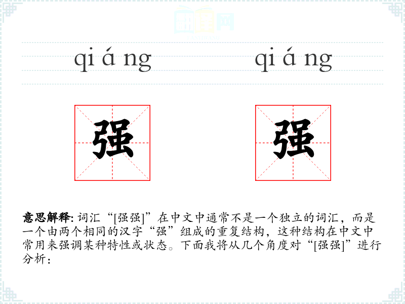 词汇“[强强]”在中文中通常不是一个独立的词汇,而是一个由两个相同的汉字“强”组成的重复结构,这种结构在中文中常用来强调某种特性或状态。下面我将从几个角度对“[强强]”进行分析: