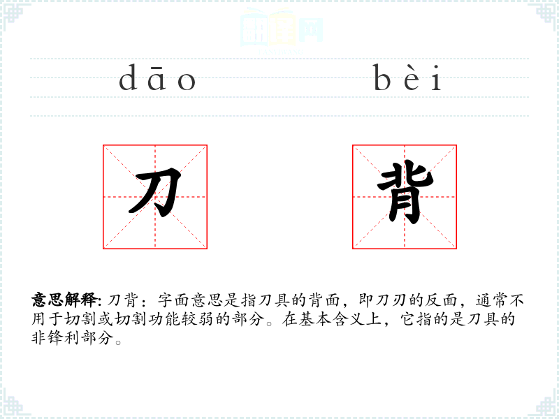 - 同义词:刀背可以与“刀侧”、“刀面”等词汇在某些语境下互换使用,但“刀侧”更偏向于指刀的侧面,而“刀面”则可能指刀的整体表面。