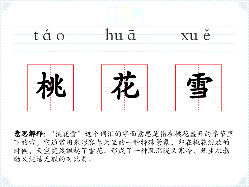 同义词可能包括“春雪”、“花雪”等,它们都指的是春天里的雪,但“桃花雪”更强调了桃花与雪的结合。反义词可能没有特别贴切的,因为“桃花雪”描述的是一种特定的自然现象。