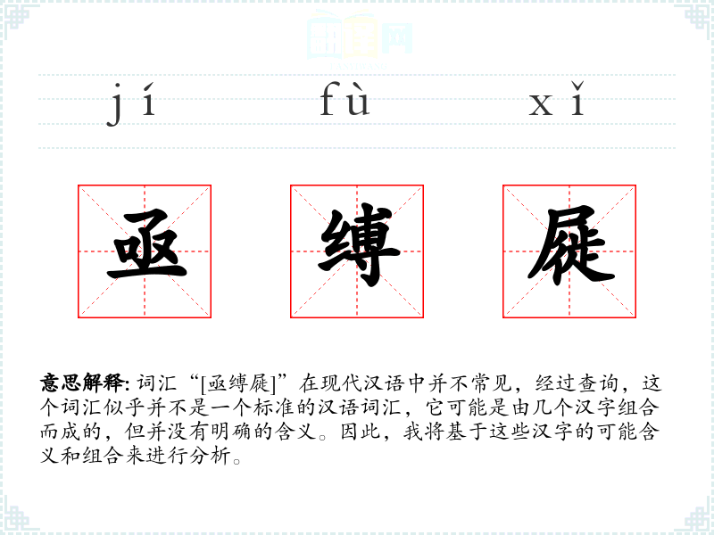 词汇“[亟缚屣]”在现代汉语中并不常见,经过查询,这个词汇似乎并不是一个标准的汉语词汇,它可能是由几个汉字组合而成的,但并没有明确的含义。因此,我将基于这些汉字的可能含义和组合来进行分析。