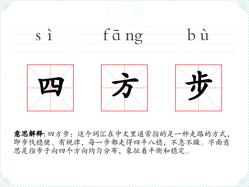 四方步:这个词汇在中文里通常指的是一种走路的方式,即步伐稳健、有规律,每一步都走得四平八稳,不急不躁。字面意思是指步子向四个方向均匀分布,象征着平衡和稳定。