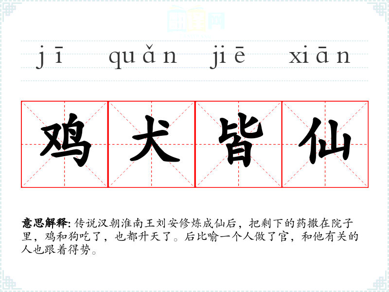 传说汉朝淮南王刘安修炼成仙后,把剩下的药撒在院子里,鸡和狗吃了,也都升天了。后比喻一个人做了官,和他有关的人也跟着得势。