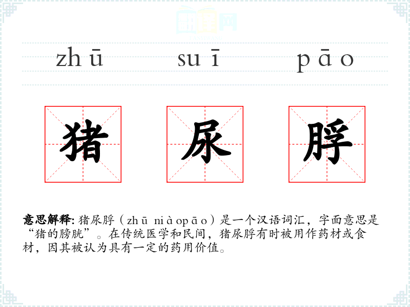 猪尿脬(zhū niàopāo)是一个汉语词汇,字面意思是“猪的膀胱”。在传统医学和民间,猪尿脬有时被用作药材或食材,因其被认为具有一定的药用价值。