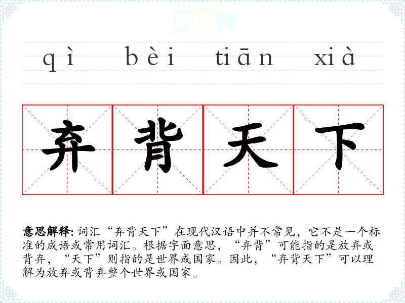 词汇“弃背天下”在现代汉语中并不常见,它不是一个标准的成语或常用词汇。根据字面意思,“弃背”可能指的是放弃或背弃,“天下”则指的是世界或国家。因此,“弃背天下”可以理解为放弃或背弃整个世界或国家。