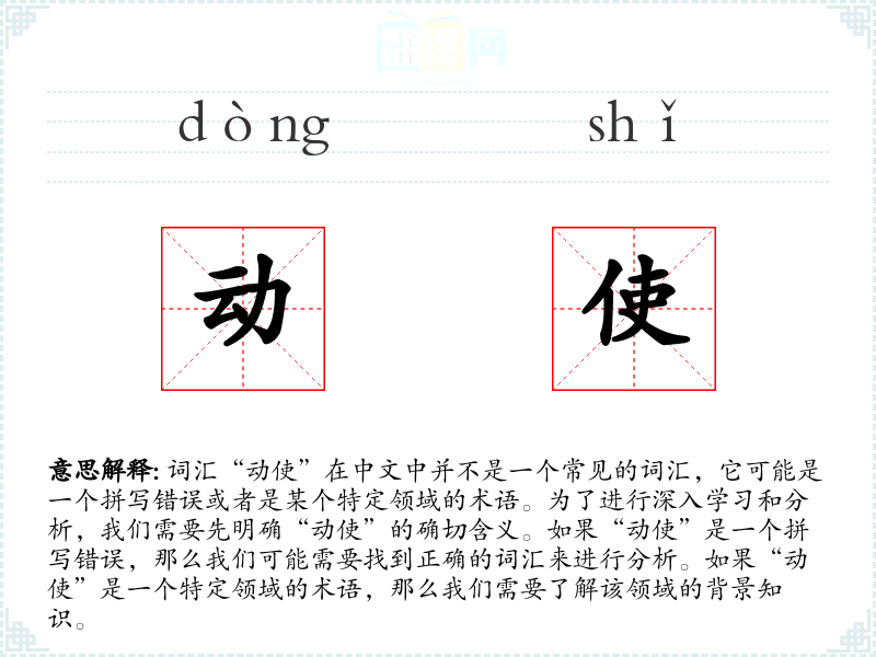 由于“动使”不是一个常见的词汇,我们无法提供一个确切的基本定义。因此,以下的分析将基于假设“动使”是一个特定领域的术语来进行。