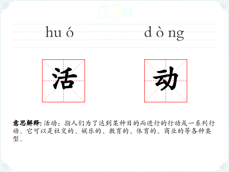 - 专业领域:在商业或教育领域,“活动”可能特指市场推广活动、学术研讨会等。