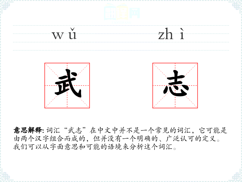 词汇“武志”在中文中并不是一个常见的词汇,它可能是由两个汉字组合而成的,但并没有一个明确的、广泛认可的定义。我们可以从字面意思和可能的语境来分析这个词汇。