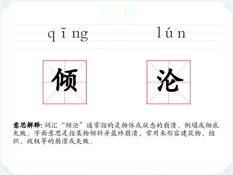 词汇“倾沦”通常指的是物体或状态的崩溃、倒塌或彻底失败。字面意思是指某物倾斜并最终崩溃,常用来形容建筑物、组织、政权等的崩溃或失败。