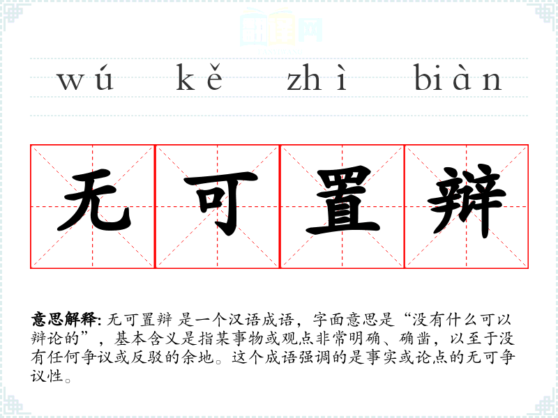 无可置辩 是一个汉语成语,字面意思是“没有什么可以辩论的”,基本含义是指某事物或观点非常明确、确凿,以至于没有任何争议或反驳的余地。这个成语强调的是事实或论点的无可争议性。
