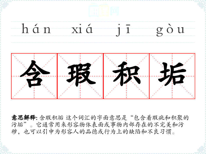 含瑕积垢 这个词汇的字面意思是“包含着瑕疵和积聚的污垢”。它通常用来形容物体表面或事物内部存在的不完美和污秽,也可以引申为形容人的品德或行为上的缺陷和不良*惯。